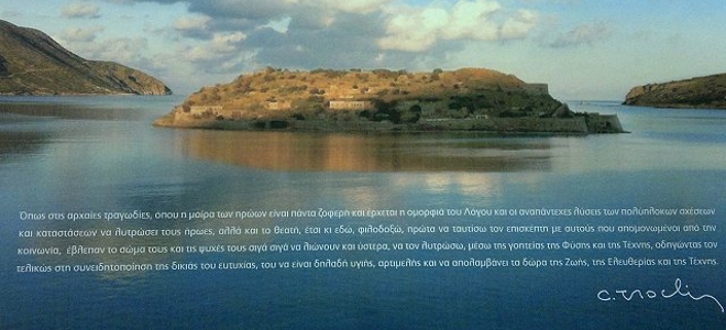 Σε έργο σύγχρονης τέχνης επιχειρεί να μετατρέψει, με μια σημαντική εικαστική παρέμβαση, το άλλοτε νησί των λεπρών, τη Σπιναλόγκα, ο διεθνώς καταξιωμένος Έλληνας καλλιτέχνης Κώστα Τσόκλης.Ο διεθνούς φήμης εικαστικός -όπως αναφέρει- θέλει να δώσει «μέσω της Τέχνης λύτρωση με τη χαρά της ζωής και όχι τη δυστυχία» και αυτές τις ημέρες ετοιμάζει πυρετωδώς στο νησί την εικαστική του παρέμβαση- έκθεση που τιτλοφορείται «Εσύ, ο τελευταίος λεπρός» και που αναμένεται να αποτελέσει πόλο έλξης χιλιάδων Ελλήνων και ξένων επισκεπτών.Τα εγκαίνια της έκθεσης θα γίνουν στις 2 Ιουνίου, στις 6 το απόγευμα με συνδιοργανωτές την Περιφέρεια Κρήτης, τον Δήμο Αγίου Νικολάου, το Μουσείο Κώστα Τσόκλη, με την υποστήριξη του Υπουργείου Πολιτισμού και ξενοδόχων της ευρύτερης περιοχής.Τα πρώτα στοιχεία των επιβλητικών κατασκευών και της ζωντανής ζωγραφικής στους εξωτερικούς και εσωτερικούς χώρους του νησιού εντυπωσιάζουν, όπως: ο μεγάλος σταυρός στην είσοδο του νησιού, οι πολυεστιακοί καθρέπτες στα σοκάκια, ο μετέωρος άνθρωπος πριν την αυτοκτονία, οι πίνακες ζωγραφικής μέσα στα άλλοτε σπίτια των λεπρών που απεικονίζουν το αίμα, το δάκρυ, αλλά και την ελπίδα για τη ζωήν τονίζουν οι οργανωτές.Στο μεταξύ, μια πρόγευση της εικαστικής παρέμβασης, που εξελίσσεται στη Σπιναλόγκα πήρε ο περιφερειάρχης Κρήτης Σταύρος Αρναουτάκης, που επισκέφτηκε το νησί με τον Κώστα Τσόκλη, συνοδευόμενος από τον αντιπεριφερειάρχη Λασιθίου Νίκο Καστρινάκη, τους αντιδημάρχους του Δήμου Αγίου Νικολάου Μανόλη Αικατερινάκη και Μιχάλη Μαρή, τον πρόεδρο της δημοτικής ενότητας Ελούντας Βαγγέλη Μαυρικάκη και τον τοπικό σύμβουλο του δημοτικού διαμερίσματος Πλάκας, Κώστα Μαυρικάκη.