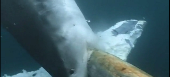 Το βίντεο αυτό έχει τραβηχτεί από υποθαλάσσια κάμερα, αφού κανένας δύτης δε θα τολμούσε να πλησιάσει τόσο κοντά τους πεινασμένους καρχαρίες και δείχνει ένα κοπάδι πεινασμένων λευκών καρχαριών να επιτίθεται σε μία τεράστια γαλάζια φάλαινα και να την τρώνε ζωντανή ενώ αυτή κολυμπάει.